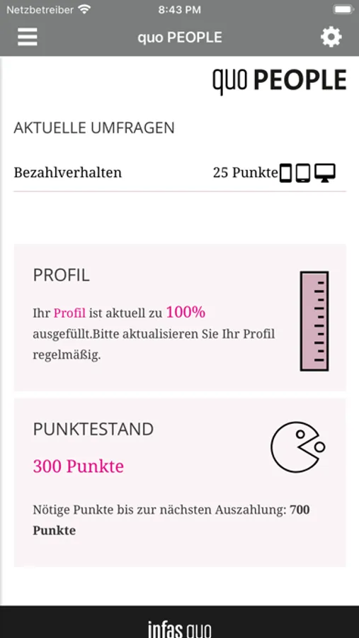 Hier haben Sie jederzeit einen Überblick über Ihren aktuellen Punktestand. Ebenso sehen Sie hier, welche Befragungen Sie bereits beantwortet haben.