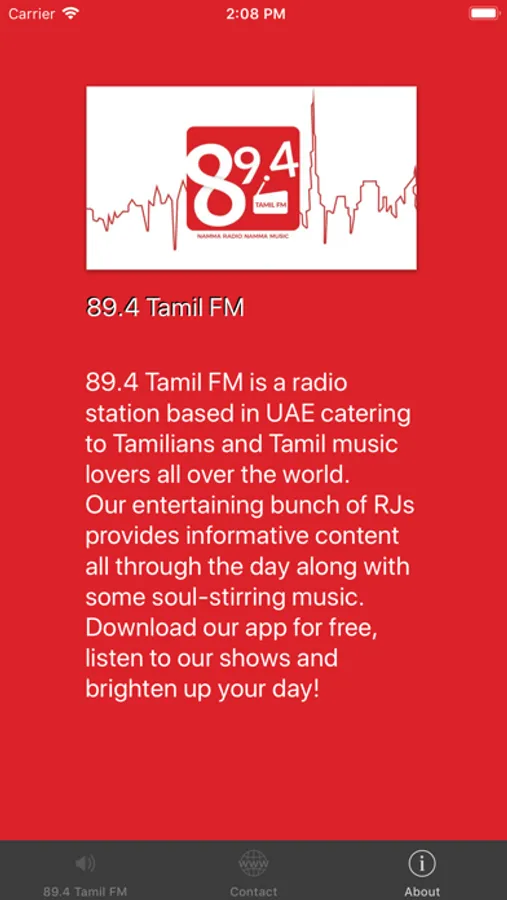 89.4 Tamil FM is a radio station based in UAE catering to Tamilians and Tamil music lovers all over the world. Our entertaining bunch of RJs provides informative content all hrough the day along with some soul-stirring music. Download our app for free, listen to our shows and brighten up your day!!