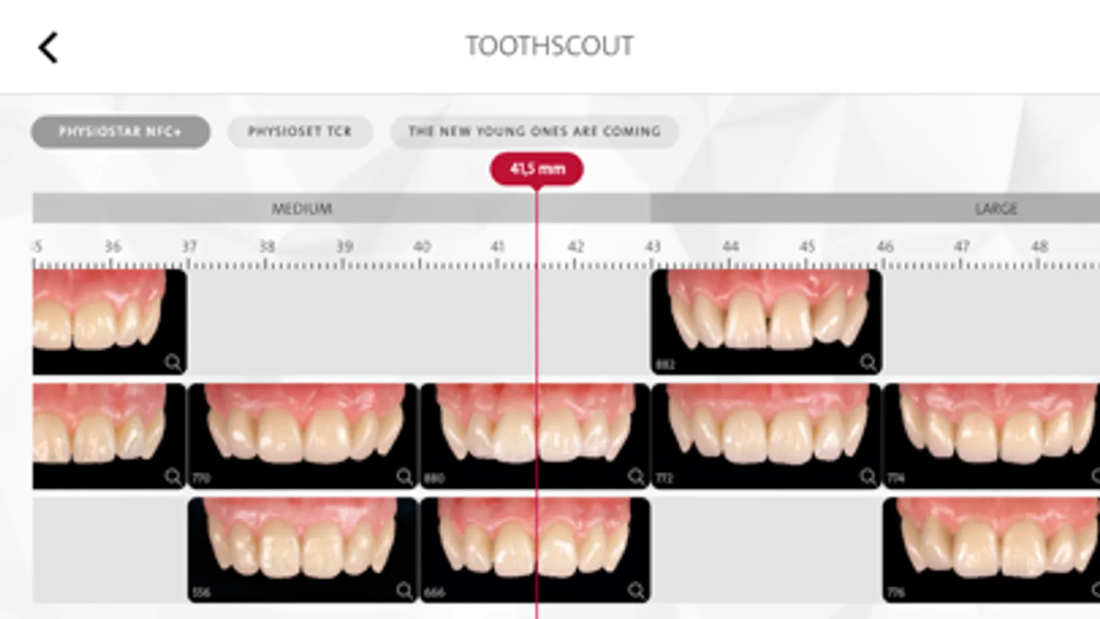 Find the right teeth for your patients. Enter the width of the alinasal and choose from a variety of tooth molds. We give you the correct references of maxillary molds to mandibular molds and the matching posterior teeth. Whether tooth-to-two-tooth or tooth-to-tooth setup, everything is available.