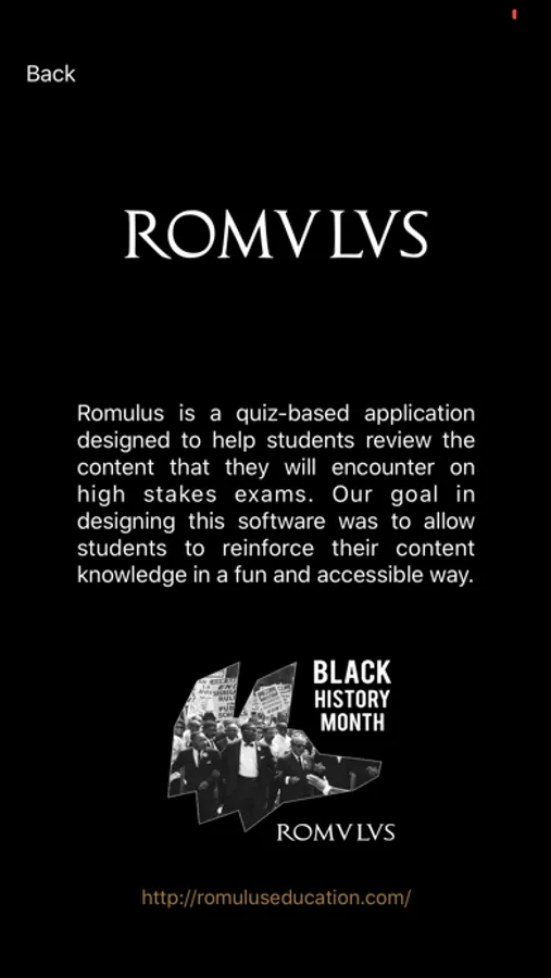 Romulus Black History Month is a quiz-based application of iOS devices designed to help students acquaint themselves with the subject of Black History.