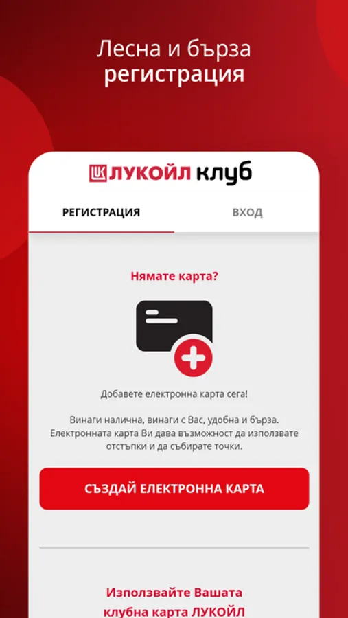 Регистрирайте се и следете текущото си потребление на гориво и натрупани точки, които можете да използвате при покупка на горива и стоки в мини-маркетите от веригата бензиностанции „ЛУКОЙЛ“.