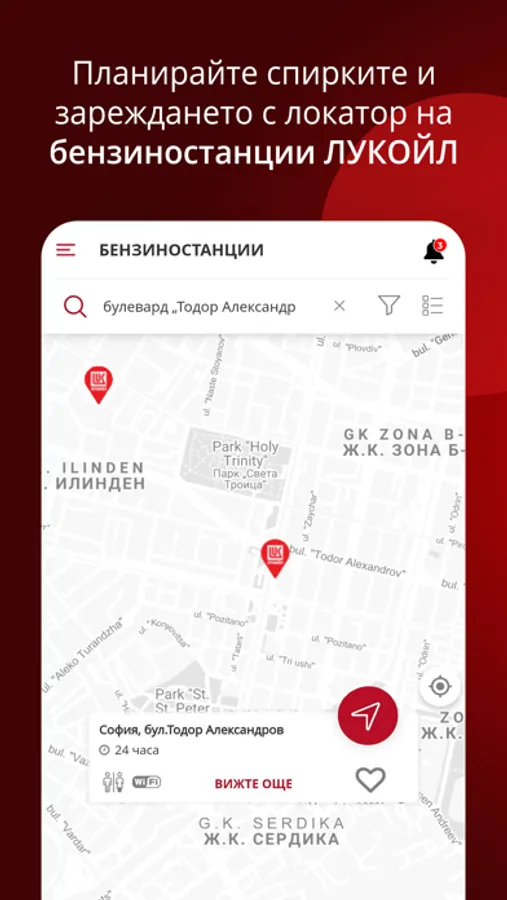 Планирайте спирките и зареждането благодарение на cписък с бензиностанции „ЛУКОЙЛ“ и услугите в тях. Бързо и лесно навигиране до най-близката бензиностанция за да заредите гориво по време на пътуване.