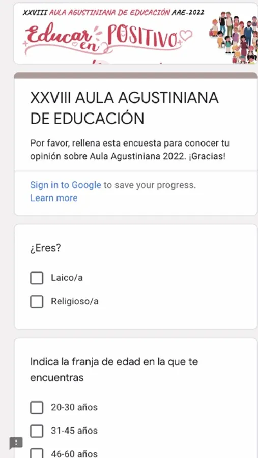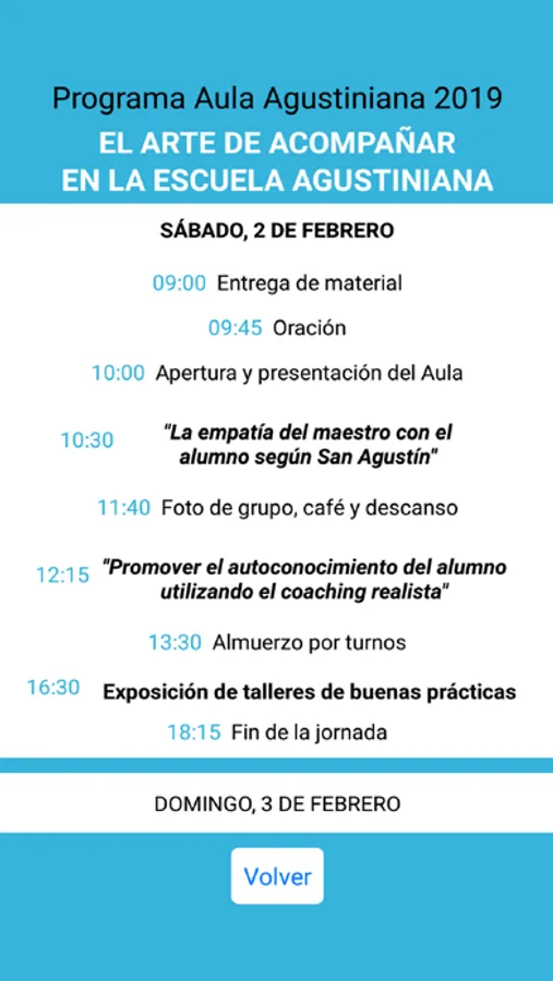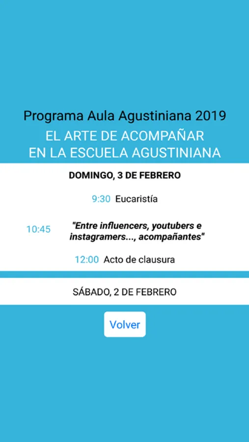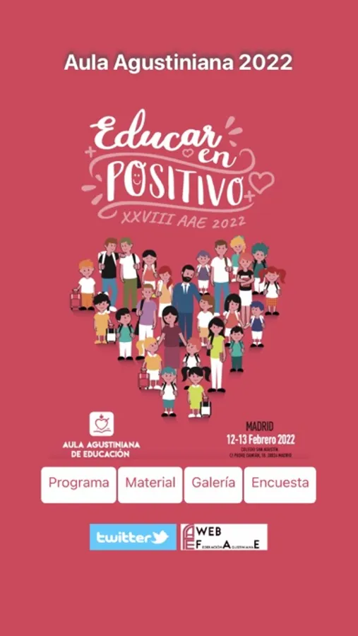 Aplicación para el Aula Agustiniana de Educación (Federación Agustiniana Española) en la que se podrá consultar toda la información relevante al evento: programa, enlaces a las redes sociales y páginas web de interés, encuesta de satisfacción