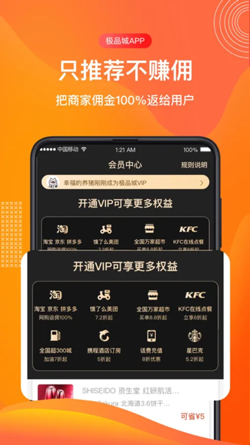 极品城,一个专注于全网自购返佣100%的网购省钱返利APP。极品城是全网首家“只推荐,不赚佣”的专业会员制电商导购服务平台。新用户更能体验首单0元购,再送108元大额电商购物津贴优惠券的活动。