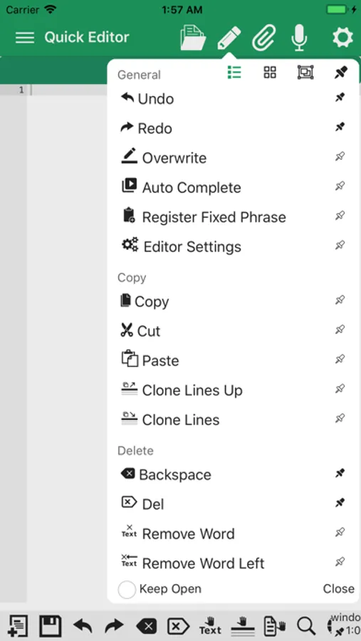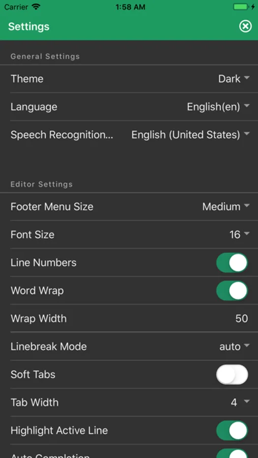 ・Editor setting (line number display, font size, line wrapping, line feed code, tab size, indent width)