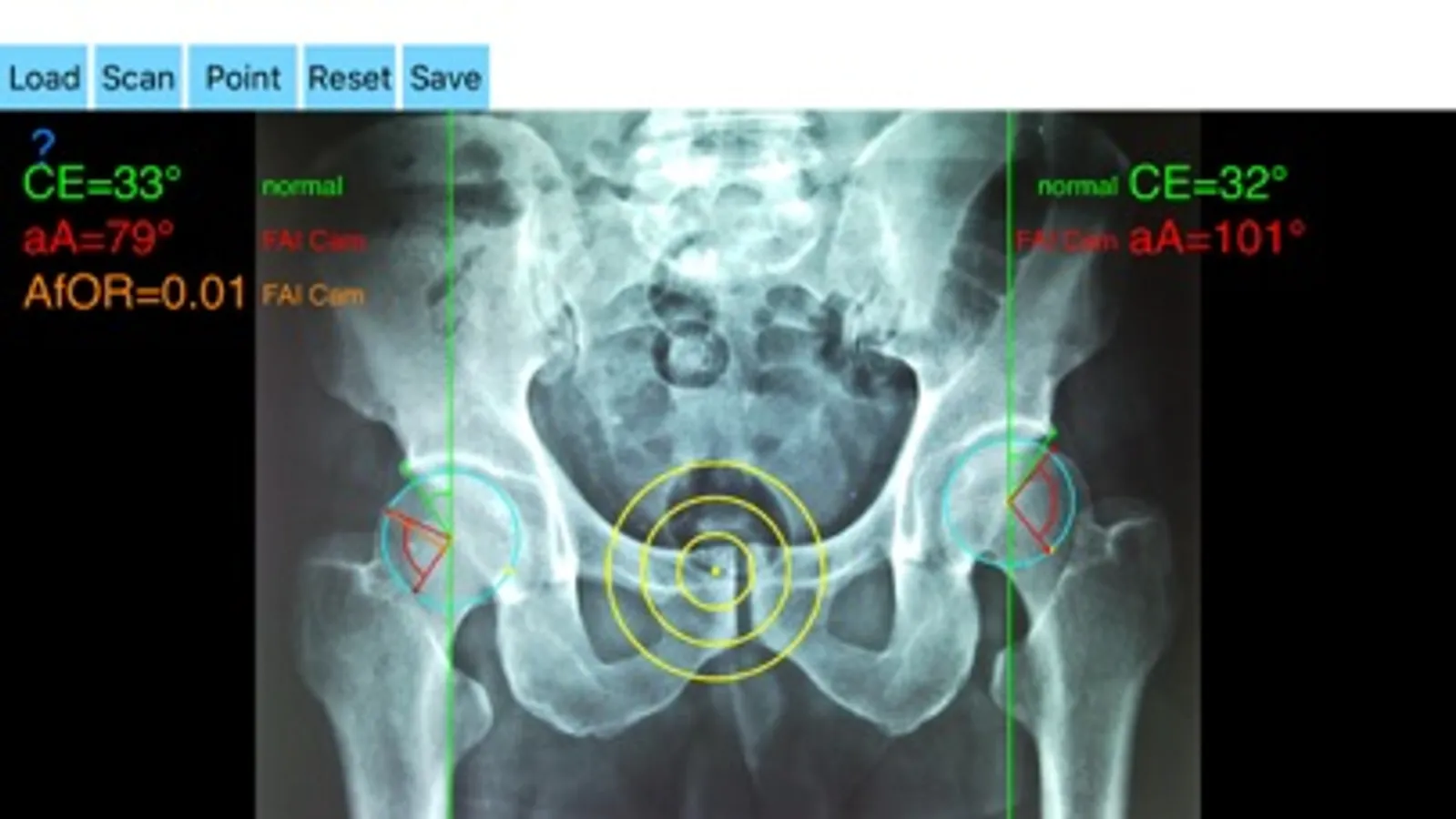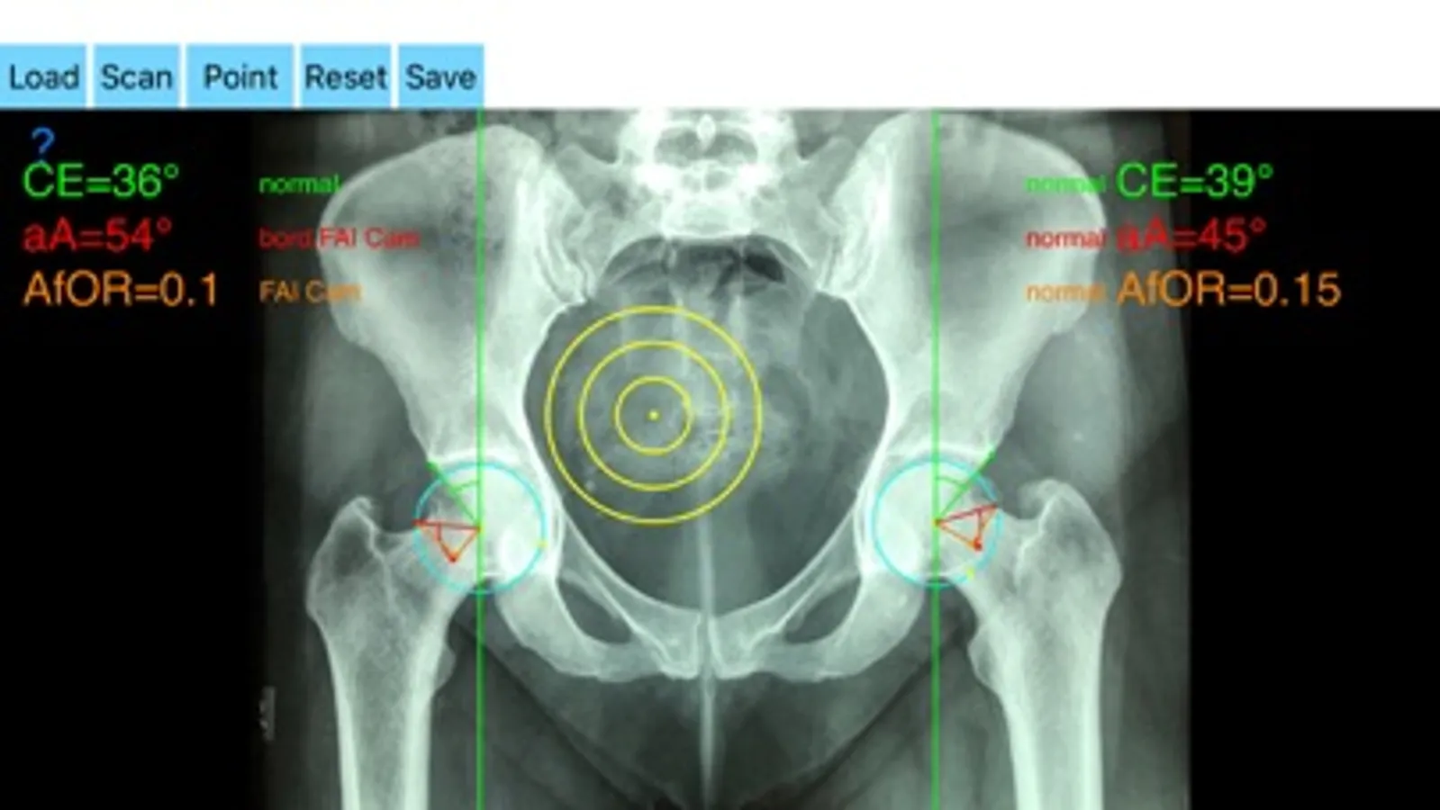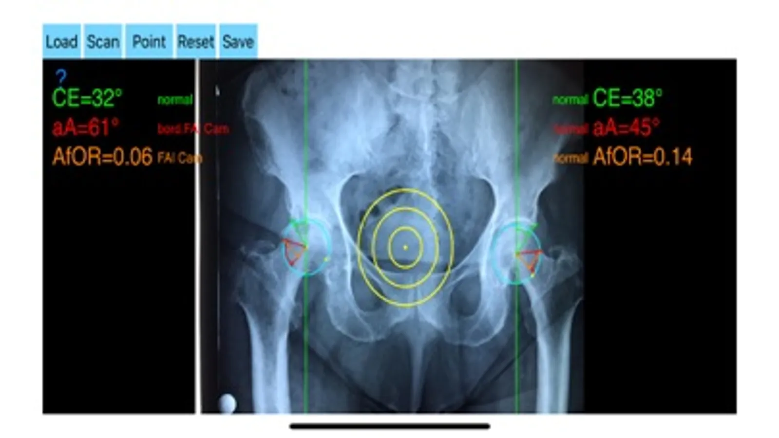 The drawn lines between points, allows app to estimate in radiographs, Center-Edge Angle (CE), α - angle (aA) and the anterior femoral offset ratio (AfOR). The measured values are compared with values from normal reference database. In case the measured angles are beyond the normal range, the hip is categorized as normal, dysplastic, borderline dysplastic hip and the type of femoroacetabular impingement (FAI) deformity namely cam type, pincer type or mixed is printed over the screen accordingly. Measures by the app are not affected by the X-ray projection.