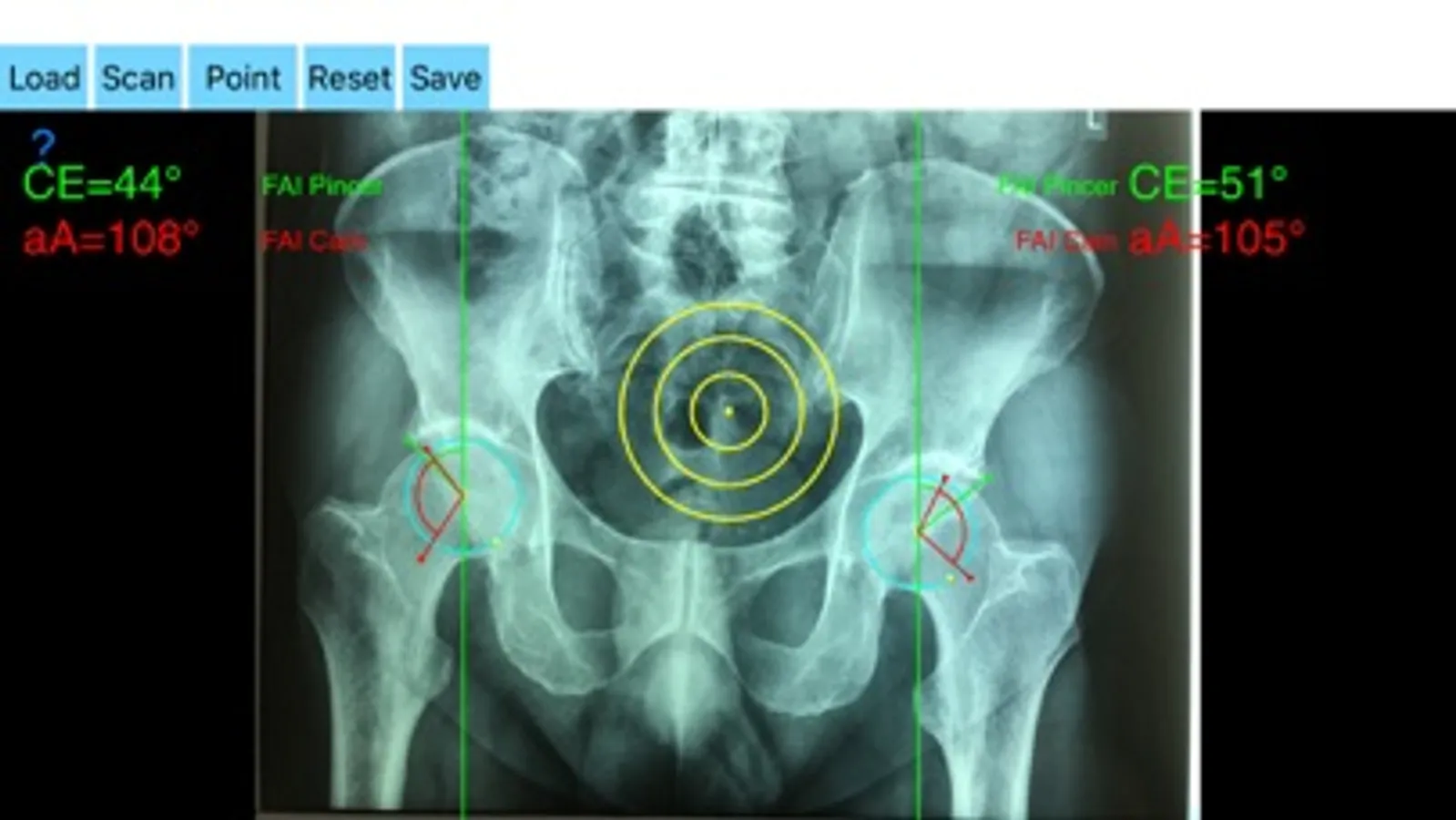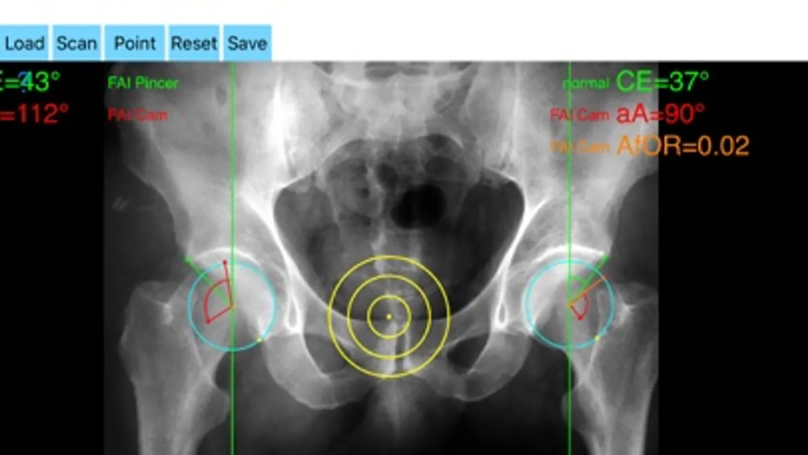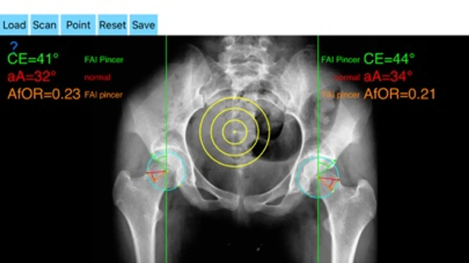 The app is a handy tool for an orthopaedic surgeon, radiologist, medical student or resident who wants objectively to monitor and determine femoroacetabular impingement (FAI) of the hip. The build-in comparison feature with the normal reference values and the combination of angles may help decide what could be considered normal or cam and or pincer type of FAI. The app is not a simple goniometer, is an enhanced product.This is particular useful especially in clinical settings where you need a quick results without losing time in looking for reference data and in doubtful cases.
