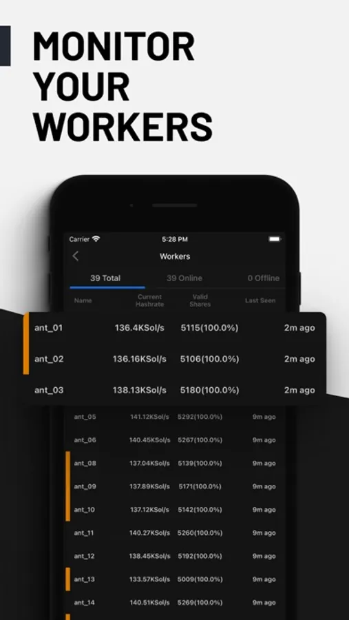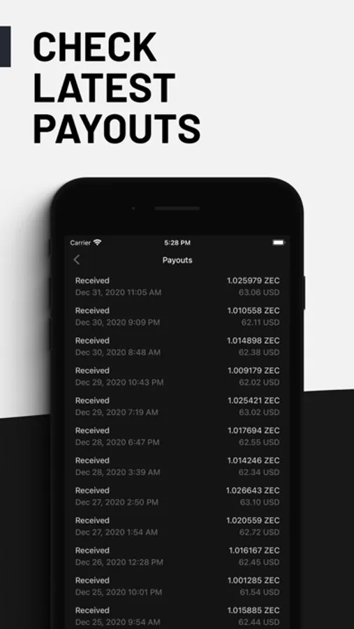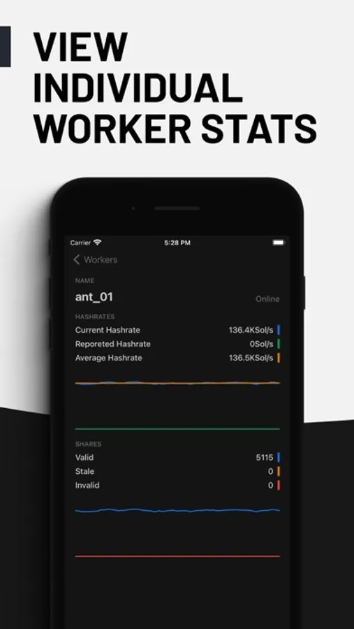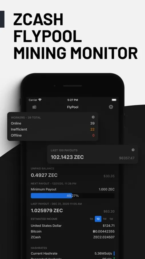- get detailed information about your accounts like online / offline workers, balance in your local currency, hashrates, payouts, shares and estimated earnings with beautiful charts illustrating the information