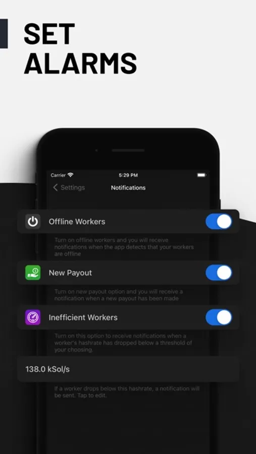 - receive notifications when a worker has gone below a hashrate of your choosing