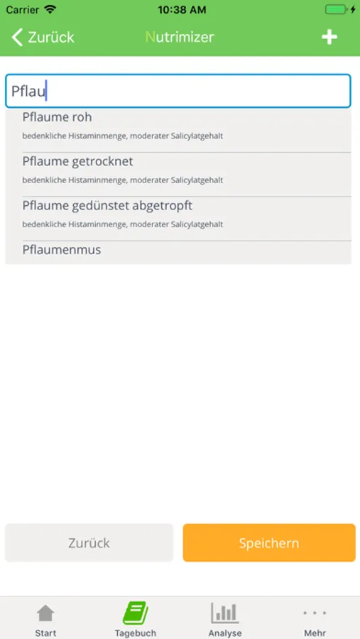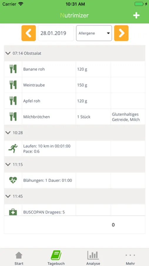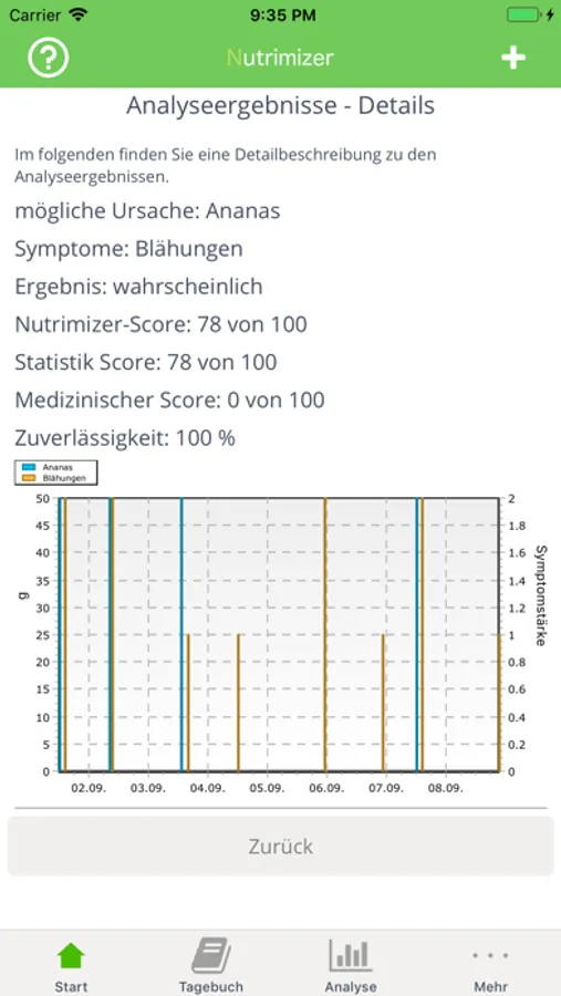 + Ausgabe von eingenommenen Lebensmitteln, Nährstoffen, Allergenen und Symptomen in Diagramform.