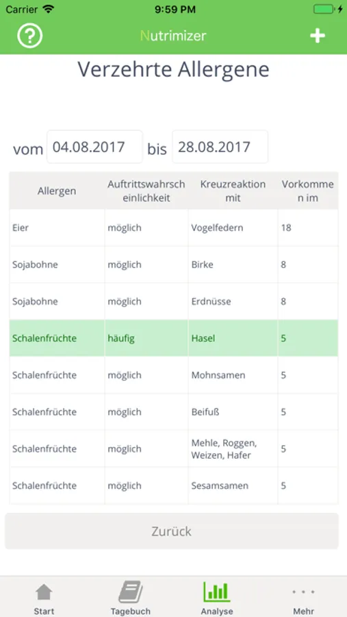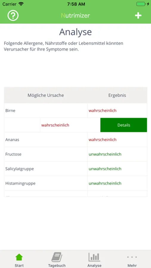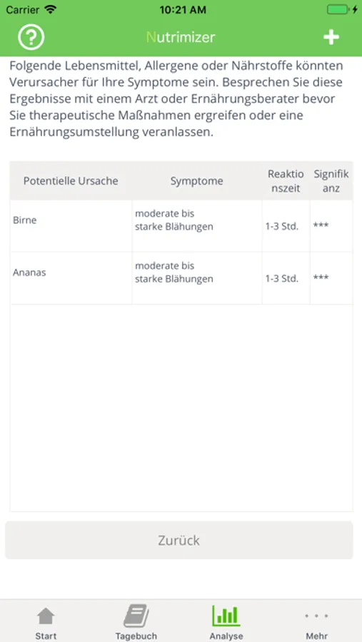 + Nutrimizer analysiert Ihr Tagebuch und zeigt Ihnen mögliche Nahrungsmittelunverträglichkeiten und -allergien an.