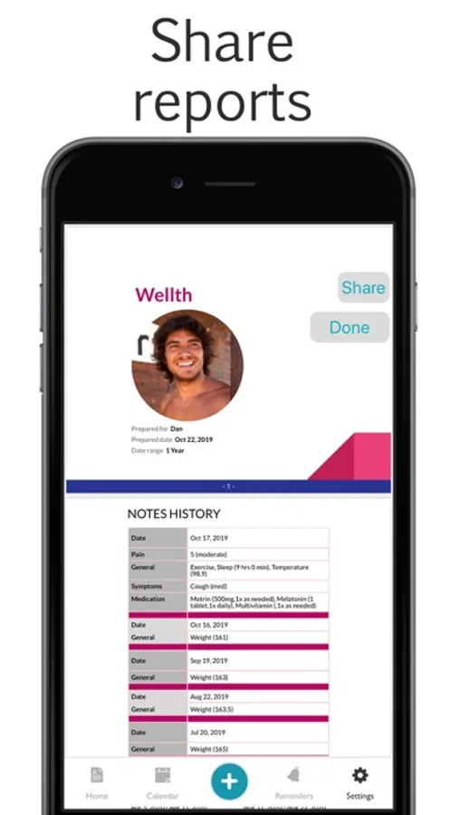 Track your daily health for a better understanding of your body and wellness. Be prepared for doctors appointments and set reminders for better habits.