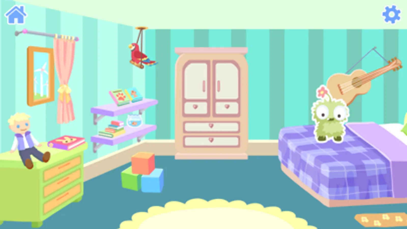 - Explore mode: There are over 100 different objects to tap on in the different rooms. The objects are presented with voice, text and 4 different illustrations.The presented objects are nouns.