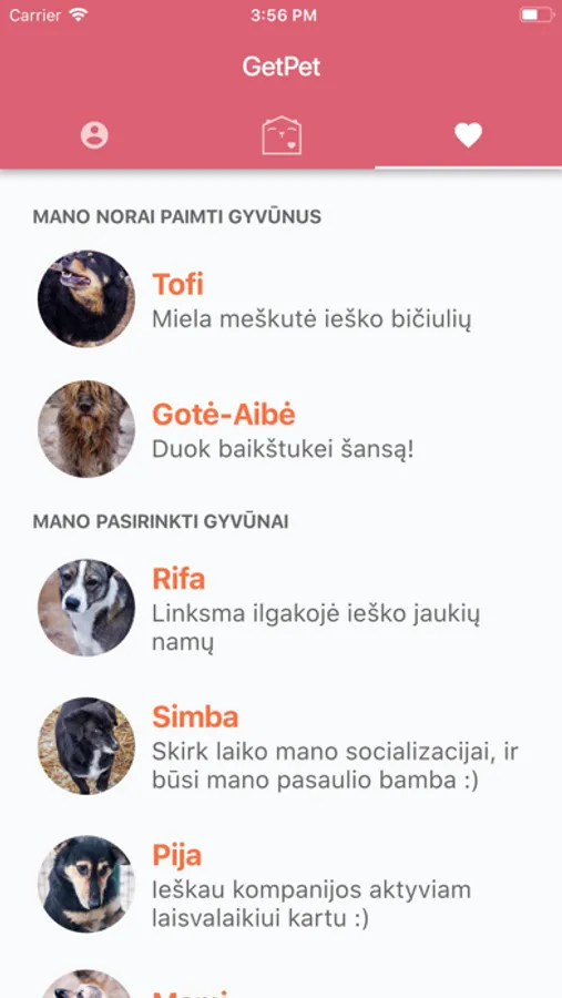 Tai lyg tinderis šuniukams. Atsidarai GetPet - į tave spokso kudlius. Jei sužavėjo, brauki pirštu į dešinę, jei ne - brauki į kairę ir randi kito šuniuko anketą. Anketoje rasi ne tik nuotraukų, bet ir gyvūnėlio istoriją.