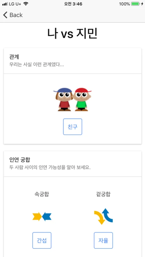두 사람의 겉궁합과 속궁합을 표시해 줍니다. 겉궁합은 장기적인 인연이고 속궁합은 개인적인 취향입니다.