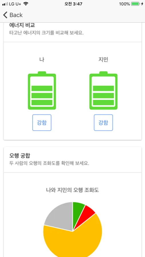 두 사람의 오행 성분을 표시해 줍니다. 서로가 답답함을 느낀다면 타고난 기질을 비교해 보세요. 기질이 서로를 보완해 주어야 편안합니다.