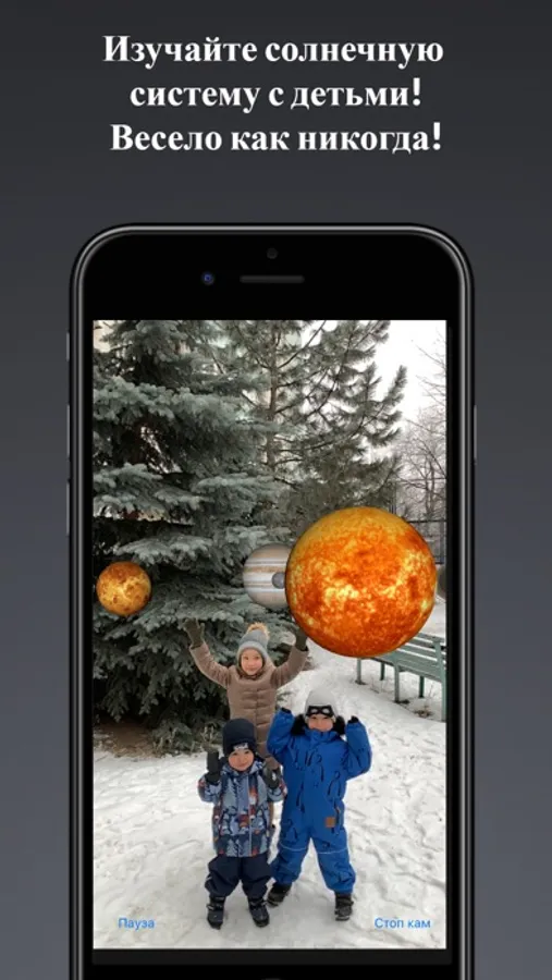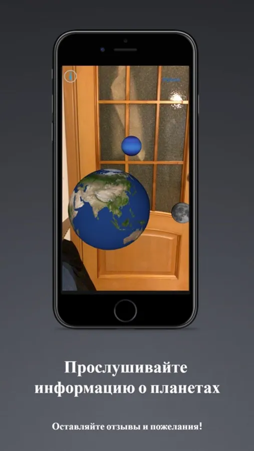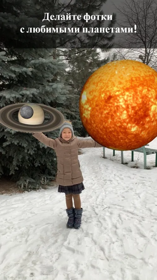 Вы можете крутить планеты, останавливать для рассмотрения, прослушать интересные факты и описание планет, сделать селфи на фоне планеты, увеличивать и уменьшать их размеры, и всё это в условиях дополненной реальности! Солнце и планеты Солнечной системы будут парить на Вашей кухне, во дворе дома или в любой точке мира, где бы Вы ни находились!