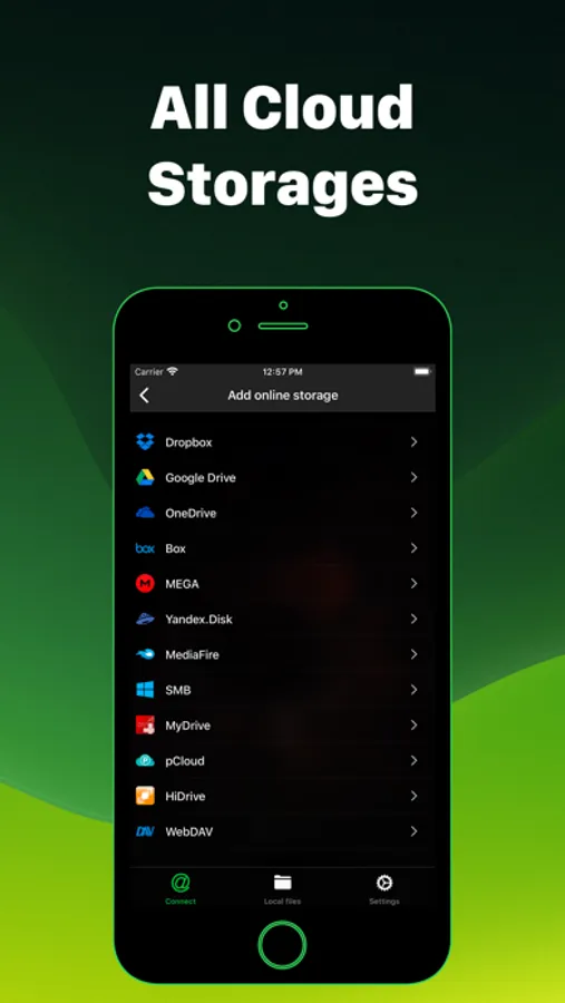 - Cloud Services. You can connect the most popular cloud services in this application: Google Drive, Dropbox, OneDrive, Box, MEGA, 百度网盘, Yandex.Disk, WD MyCloud Home, InfiniCLOUD, MediaFire, WebDAV, SMB, MyDrive, pCloud, HiDrive, Put.io.