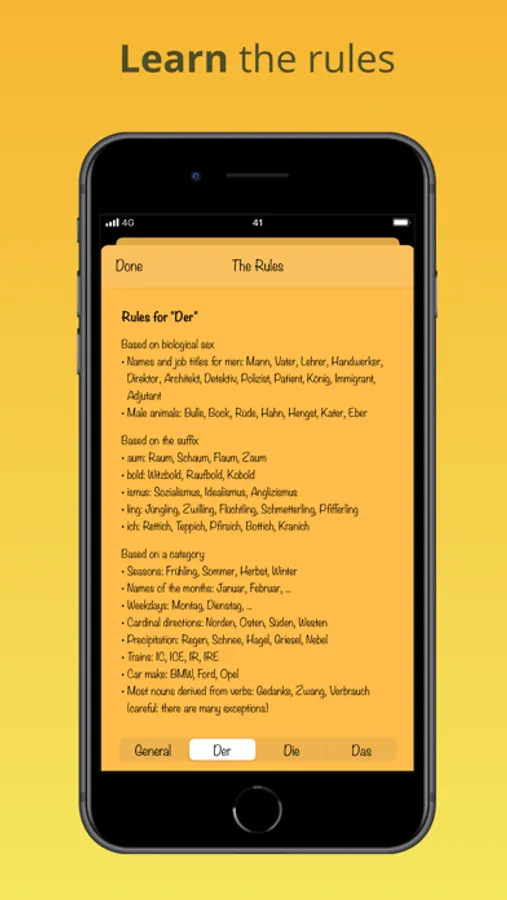 Der Die Das? brings order to the chaos. Using cards organized in decks you will stay on top. There are way more than 300 words included in the app. Future updates will increase this number.