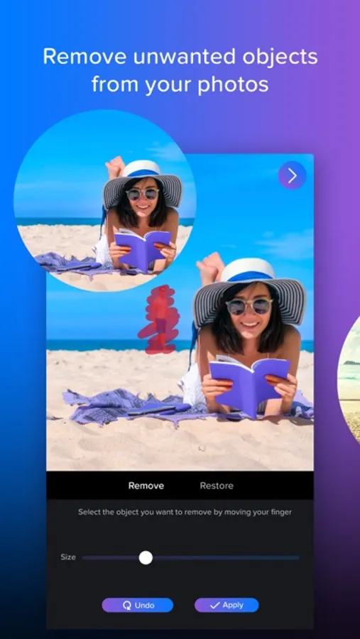 - Magic eraser tool that removes unwanted objects on your photos.