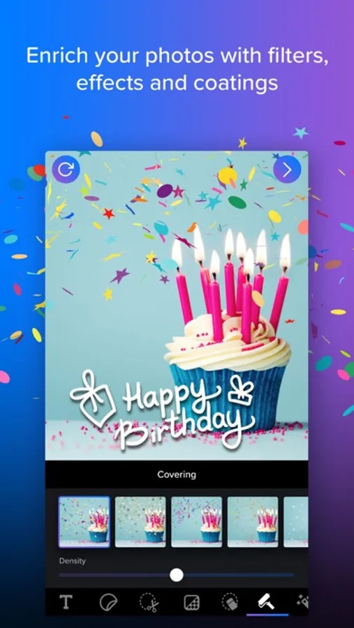 The professional photo editor application, Phonty allows you to make beautiful editings, fabulous designs and stunning collages with the high-tech tools, the simple usage, and the rich contents.