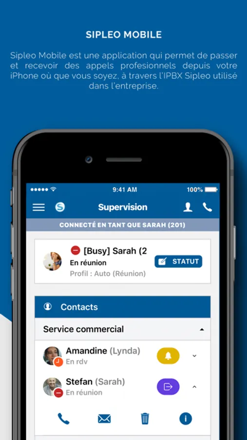 Aujourd’hui, Sipleo, c’est aussi sur votre mobile. Retrouvez l’annuaire et le journal d’appels de votre entreprise sur votre téléphone portable. Vous aurez également la possibilité de superviser l’activité de vos collaborateurs au bureau et de les joindre comme si vous étiez dans les locaux avec eux. L’application Sipleo est un vrai plus pour les commerciaux et pour votre entreprise qui uniformisera sa manière de communiquer.