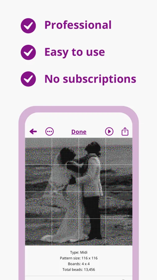 "Whoever the developer is, you know exactly what bead artists need and are constantly evolving the app with new features. This is designed to be used in entry level hobbyists to the advanced pro with its versatility.I will start every project with this app from now on." - By Zomberic on the App Store