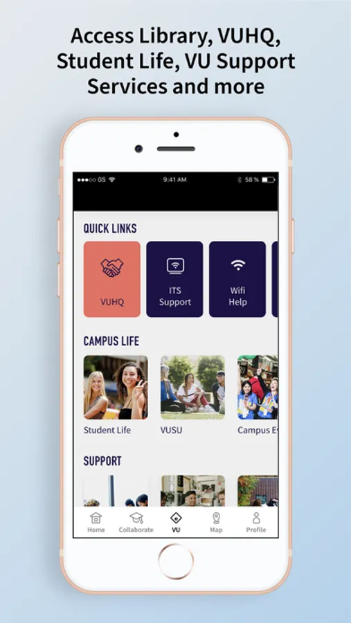- Browse an array of specialised VU services and facilities including VU Library, ITS, Student Life, Support and more