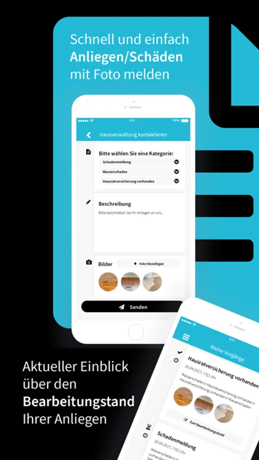 Als Mieter oder Eigentümer können Sie Schäden oder Anliegen direkt mit Fotos über unsere App melden. Ihre Anfragen stehen unseren Mitarbeitern dann zur Bearbeitung zur Verfügung und können auch an Handwerksbetriebe weitergeleitet werden.