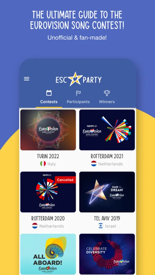 ESC Party is a guide to the Eurovision Song Contest from 1956 to 2023. This is an unofficial fan-made app allowing you to explore Eurovision like never before. Features include: