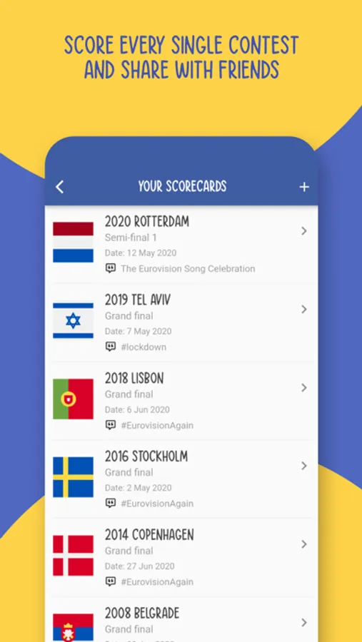 Score any Eurovision Song Contest, save your scorecards to your profile and share them to social media!