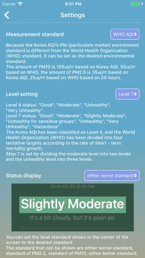 - World Health Organization (WHO) standard, Chinese standard, Korea Environment Corporation standard selection.