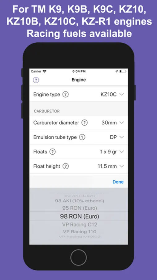 • Selectable fuel type (gasoline with or without ethanol, Racing fuels available, for example: VP C12, VP 110, VP MRX02)