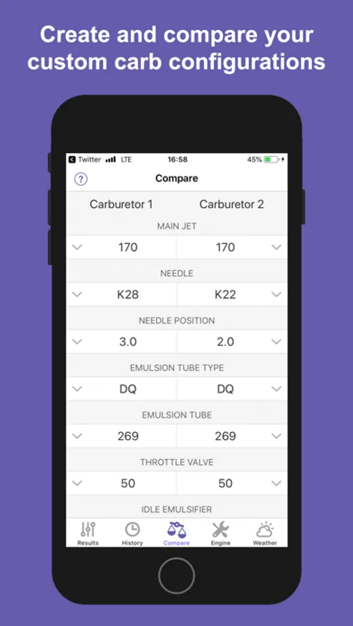 • Compare: On this tab, you can compare two carburetors. To do this, you need to set all the components of the carburetor. The result will be shown in the form of graphs of the ratio of air and fuel (or lambda).