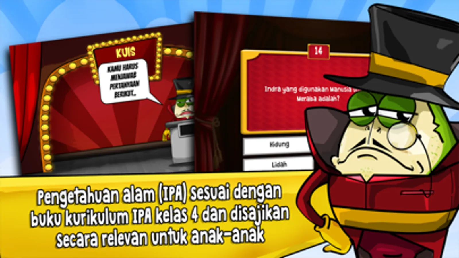 Yuk kita bantu teman-teman kita untuk melawan Pak Lurah Korup. Yang dibutuhkan adalah kepandaian (baca: JAGO) IPA kelas 4 dan ketangkasan bermain. Skullboy, Pugabee, Froggy, dan Roboto akan sangat berterima kasih.