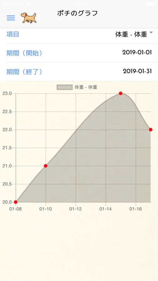 - 体重などの数値記録を、グラフでわかりやく表示。