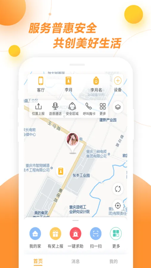 实时查看亲人、好友、紧急联系人的地理位置,实现亲友的活动轨迹实时预览,并且可以辅助智能穿戴设备,实时呵护您的家人和朋友。