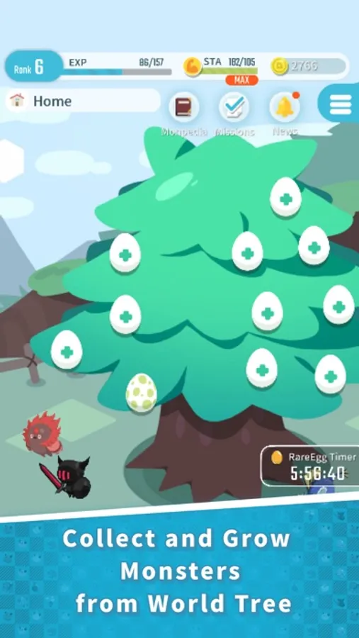 You can hatch cute monsters by tapping eggs from the tree.