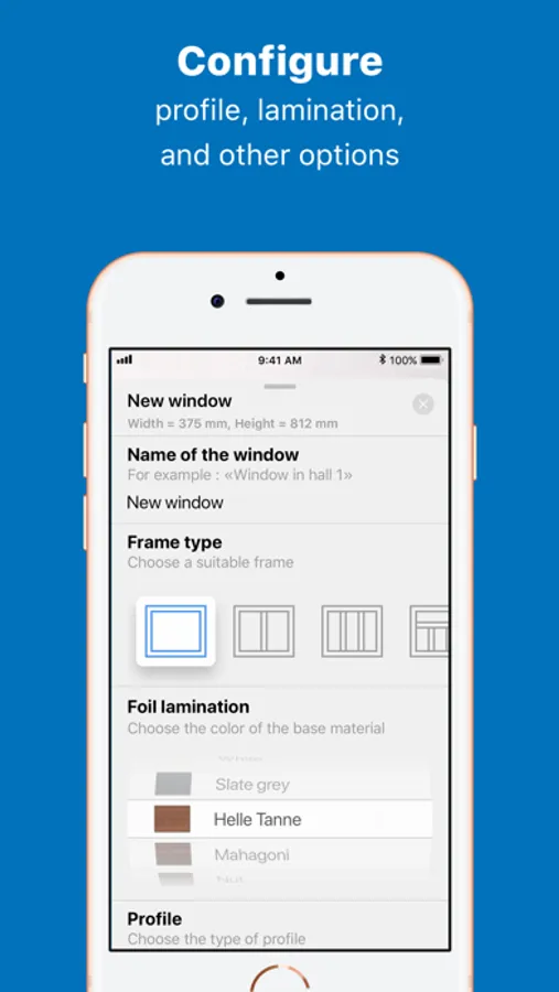 b) Configure possible options for using different PVC profile systems, lamination colors, etc.
