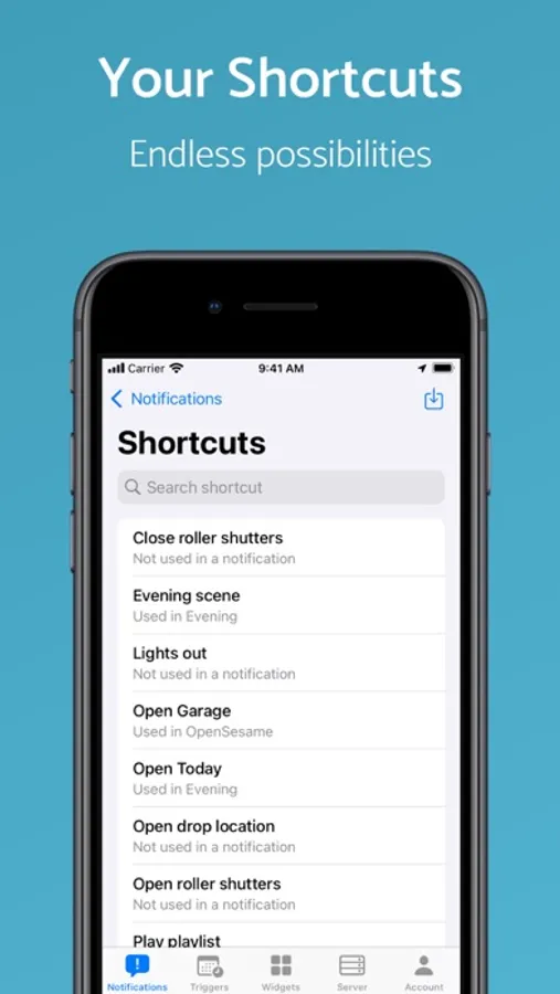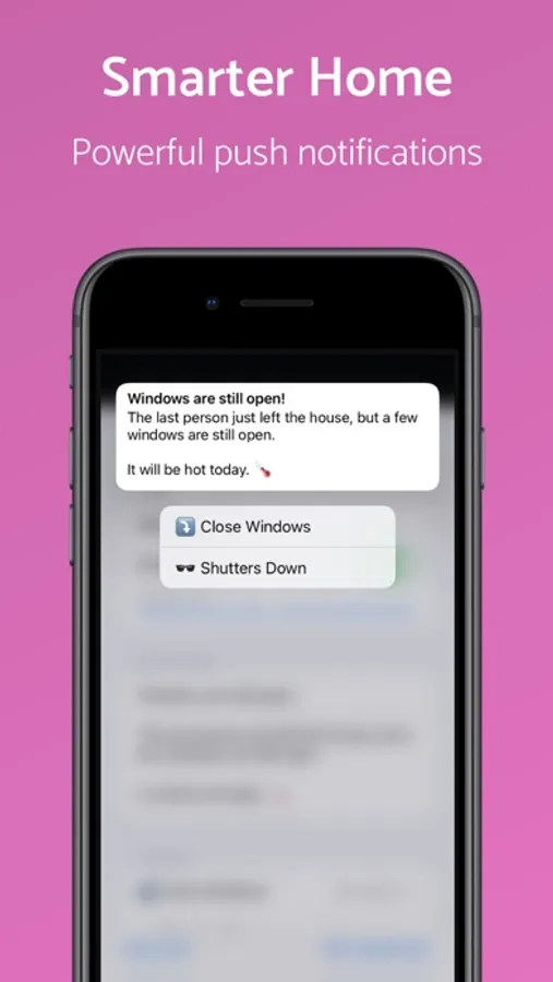 Use HomeKit scenes, shortcuts, online integrations, and web services as notification actions that pop up exactly when they matter to you. Trigger these smart notifications from Shortcuts, HomeKit, schedules, locations, iBeacons, online services (like IFTTT, Zapier, Flow, Integromat, ...), home servers, or anywhere that knows what HTTP is.