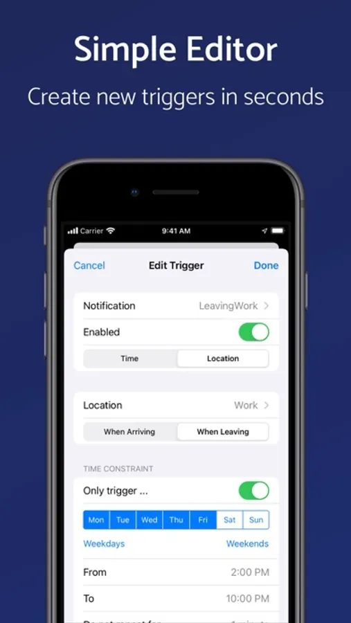+ Combine time and location triggers (eg: "weekdays at 6 PM when I am at work")