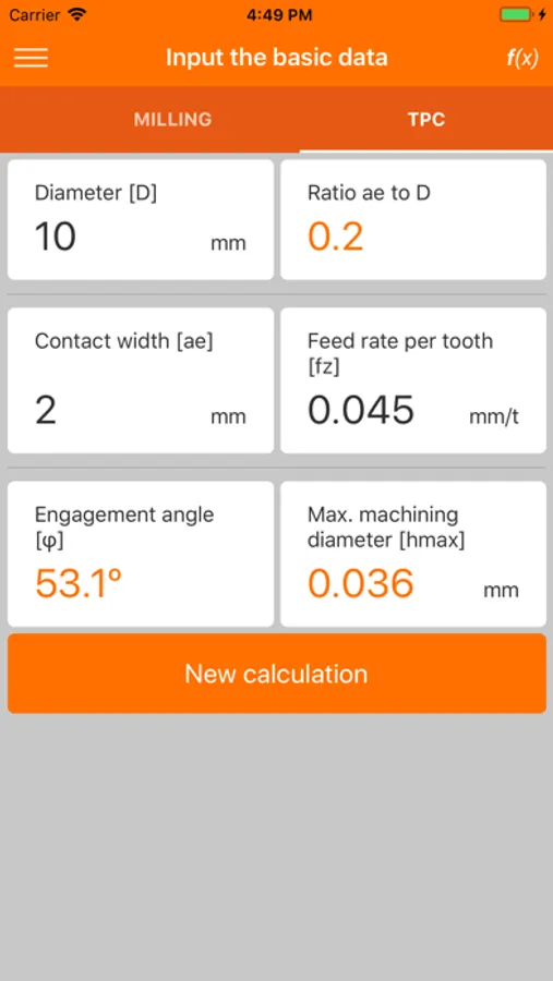 Calculate the relevant parameters for your application using a few entries. In this case, it is possible to calculate the cutting width, feed rate per cutting edge, cut arc angle and the maximum cutting thickness.