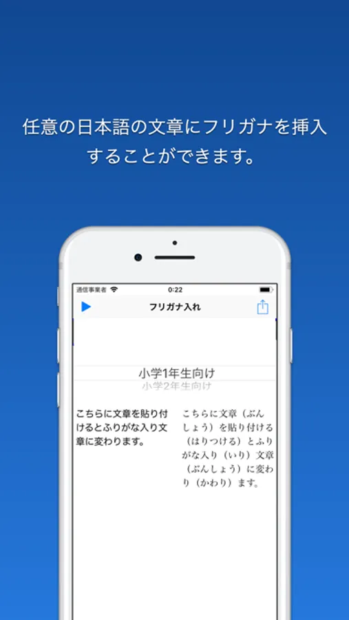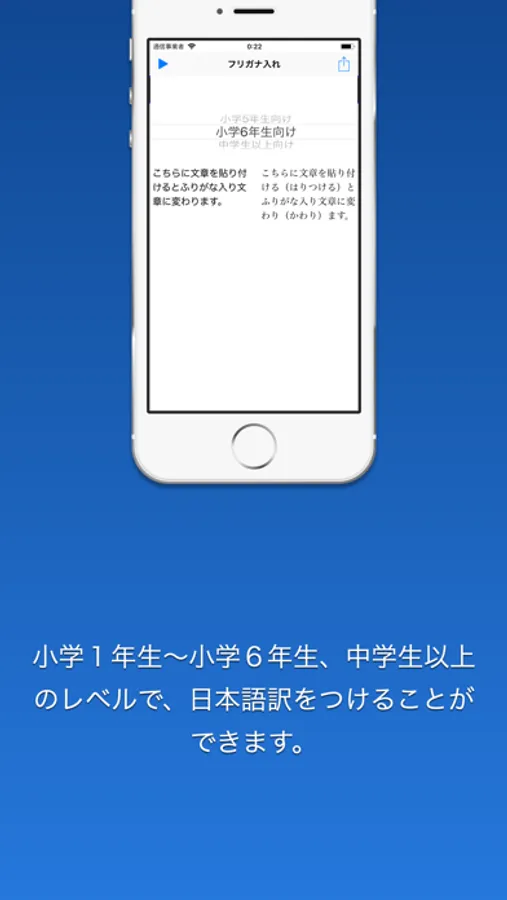 日本語(にほんご)の文章(ぶんしょう)をアプリ内(ない)に貼り付ける(はりつける)と、その文章(ぶんしょう)にふりがなを入れ(いれ)てくれます。小学(しょうがく)1年(ねん)生(せい)から中学生(ちゅうがくせい)以上(いじょう)まで、ターゲットに合わせ(あわせ)たレベルのふりがなを入れ(いれ)てくれます。