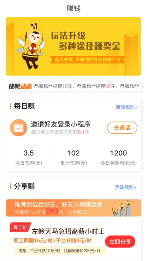 分享每日获福利、推荐好友赚佣金,新手任务无门槛、完成任务就挣钱,运营活动抽大奖、参加就送奖励金。