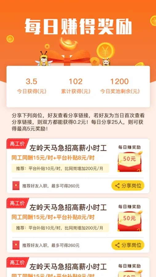 求职者通过朋友分享的招聘信息获得高工价,分享者亦可获得一定报酬,和老乡、朋友一起获得高薪好职!