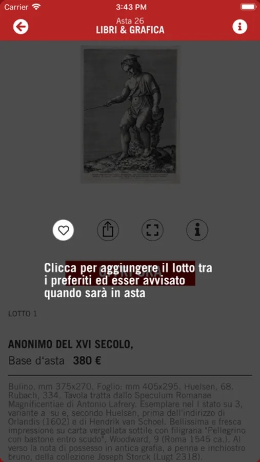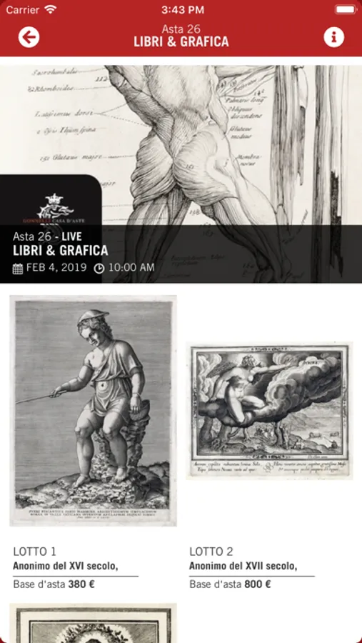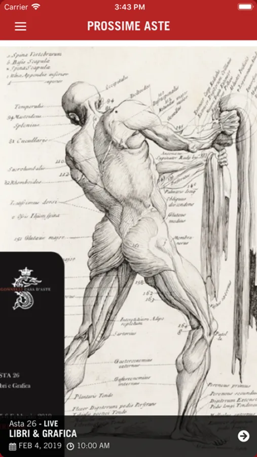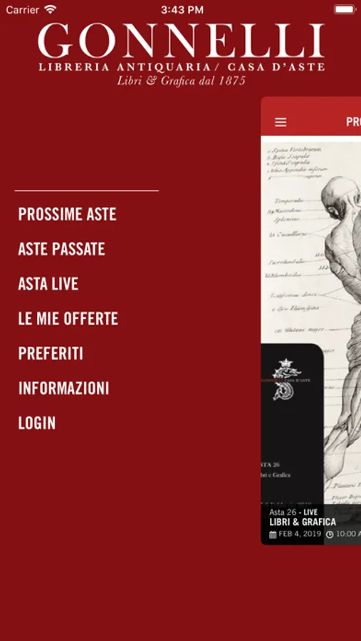 Uno strumento gratuito, innovativo e intuitivo, l’app Gonnelli permette agli appassionati e ai collezionisti di libri e opere grafiche di entrare, attraverso semplici gesti e in qualsiasi momento, nel mondo delle nostre aste. Tramite la registrazione hai accesso a funzionalità avanzate come seguire le aste, aggiungerle al tuo calendario, ricevere promemoria, visualizzare, seguire i tuoi lotti aggiunti ai preferiti, vedere i risultati delle aste passate e sopratutto la possibilità di fare offerte in tempo reale, come se tu fossi in sala.