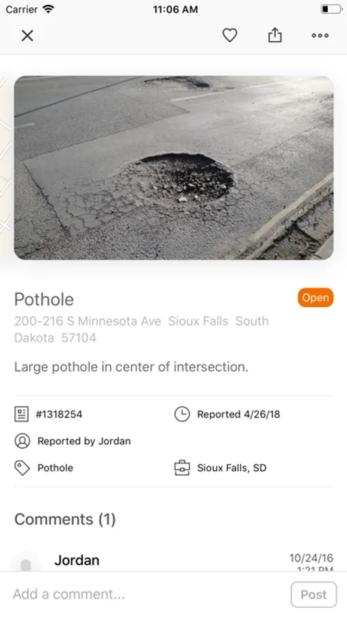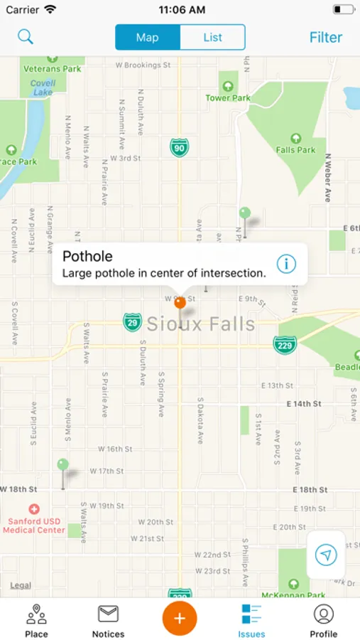 Reporting a pothole has never been easier! Simply download the City of Sioux Falls mobile app! The app can be used to ask a question or report a variety of nuisances, including potholes, graffiti, damaged street signs, abandoned vehicles, and more. You can even upload a photo with your report. Every report is immediately routed to the appropriate team so they can quickly respond and provide an answer or solution. In addition to tracking the reports that you’ve submitted, the app allows you to view reports submitted by other users, and learn when they’ve been resolved.