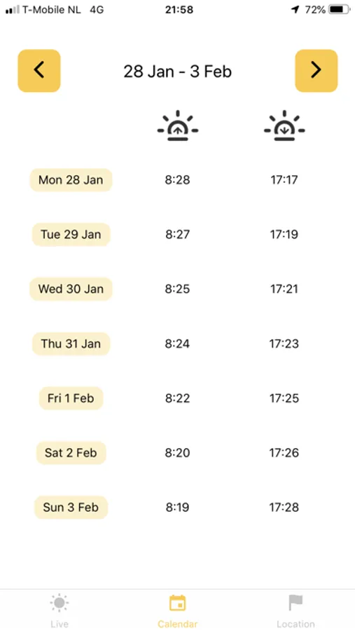 A simple and beautiful app to see the time of first light, sunrise, sunset and last light all around the world. Adjust the location yourself or use your phone's location.