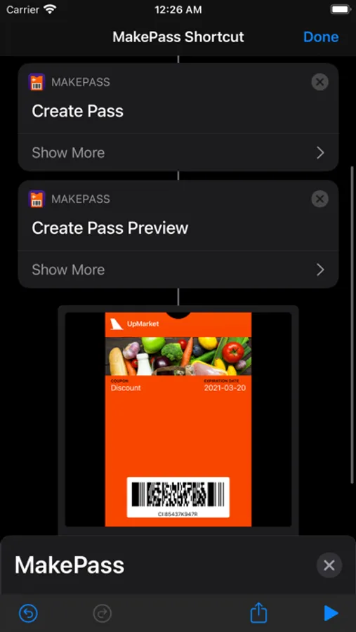 • The “Create Pass” Shortcuts action supports both opening the result on MakePass or generating the pass file inline.