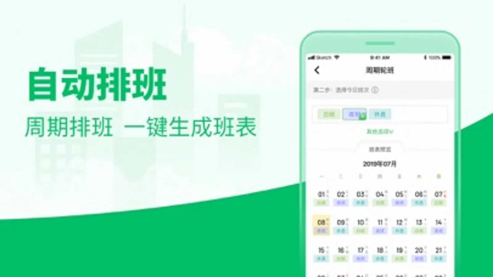 周期和手动两种排班方式,分别针对周期固定和不固定的工作人群;操作流程简单,可根据一个周期的工作安排自动生成专属工作班表
